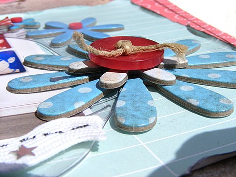 I altered the ricrac, by drawing on it and sticking on little stars. The Dimension is created by curling the edges of the paper and layering chipboard + button :-)
